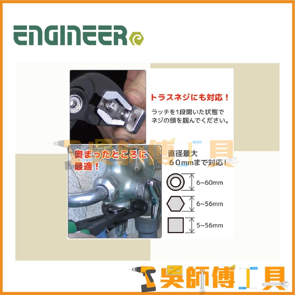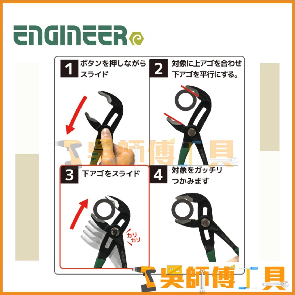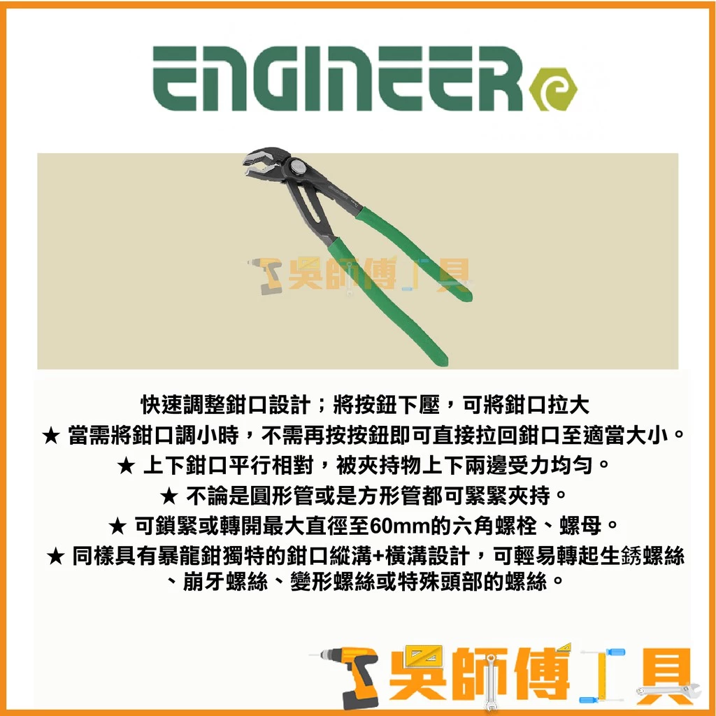 首頁 > 全部商品 > 手工具配件品牌 > ENGINEER > 日本原裝 ENGINEER PZ-81水管螺絲鉗/水管鉗/水道鉗/鯉魚鉗/暴龍鉗